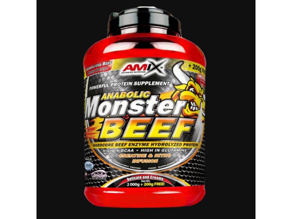 Okamžitá dodávka všech potřebných aminokyselin, vynikající nutriční hodnoty, dokonalá rozpustnost, zanedbatelné množství tuků a sacharidů, minimální vynaložená energie potřebná pro trávení, vysoký obsah důležitých minerálů to vše Anabolic Monster Beef Protein. Výhody rychlé dodání aminokyselin excelentní nutriční hodnoty nízký obsah sacharidů lehce stravitelný protein obohacený o kreatin monohydrát Amix ™ Anabolic Monster Beef Protein je obohacen o kreatin monohydrát, který podporuje zvýšení energetického potenciálu, výbušnou sílu, zrychlení regenerace a tvorbu svalové hmoty. Anabolic Monster Beef obsahuje Nitro Shot Comlex, jehož složky zahřejí vaše krevní řečiště a zajistí rychlejší přísun živin přímo do svalových vláken.