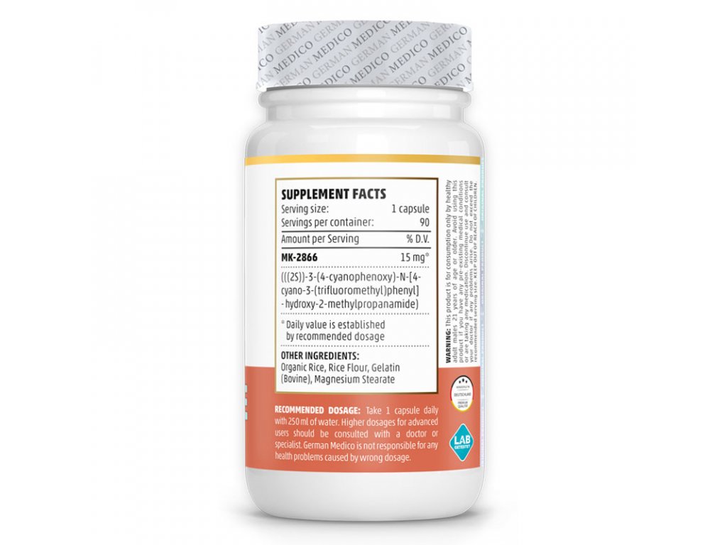 MK-2866 (((25))-3-(4-kyanofenoxy)-N-[4-kyano-3-(trifluormethyl)fenyl]-hydroxy-2-methylpropanamid): 15 mg