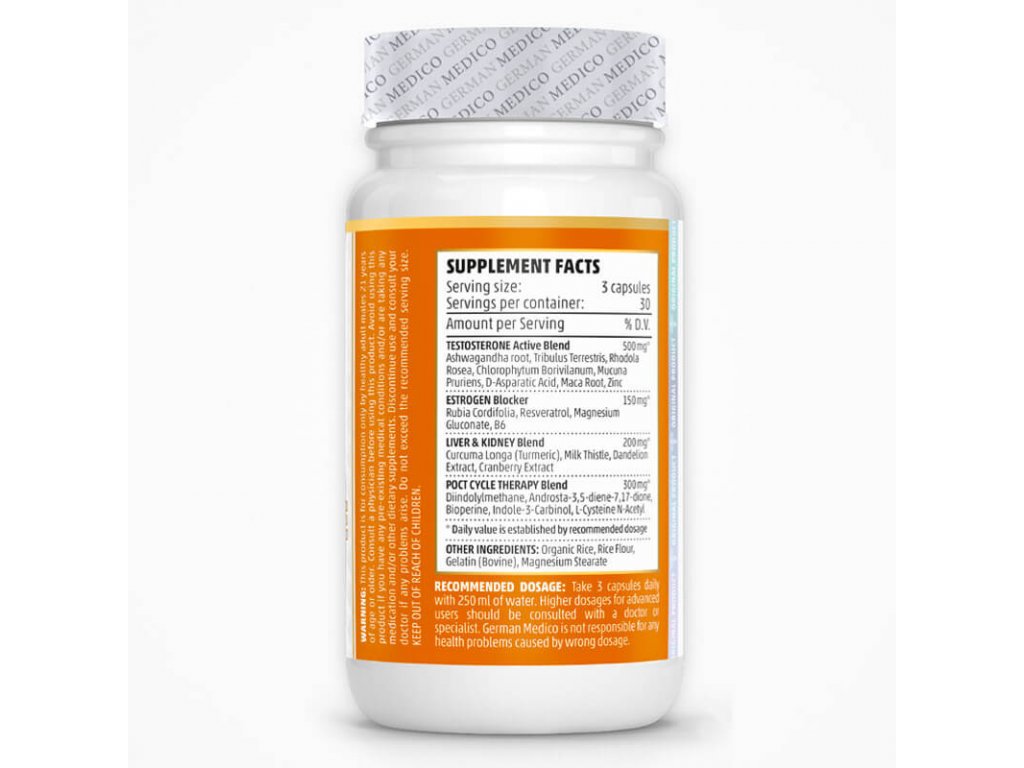 Jeho aktivní složky přirozeně podporují produkci testosteronu, zmírňují stres a uvádějí tělo do regeneračního stavu. GERMAN MEDICO Performance PCT navíc obsahuje různé antioxidanty a protizánětlivé látky, které pomáhají minimalizovat poškození volnými radikály a zánět, který může být vyvolán intenzivním tréninkem nebo steroidními cykly. Jeho jedinečná směs účinných látek usnadňuje rychlou regeneraci a omlazení těla a umožňuje vám rychle získat zpět energii a kondici.
