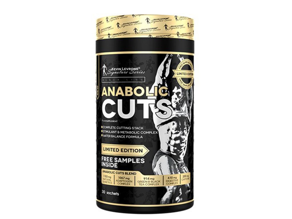 Kevin Levrone Anabolic CUTS ® je směsí extraktů ze zeleného čaje, zázvoru, kajenského pepře a dalších látek, které jsou nositelkami vysoce účinných termogenních látek způsobujících silnou redukci tukových tkání. Extrakt z listů zeleného čaje obsahuje epigalokatechin galát (EGCG), který usnadňuje spalování tuků, posiluje a chrání imunitní systém před škodlivými účinky volných radikálů a má velmi pozitivní vliv na činnost oběhového systému. Kofein je látka, která blokuje adenosinové receptory v mozku, což snižuje příznaky únavy a povzbuzuje ke zvýšené fyzické a psychické výkonnosti.