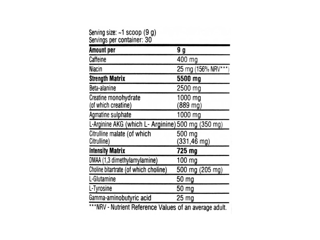 Kromě DMAA obsahuje aminokyseliny jako je beta-alanin, kreatin, kofein, citrulin malát, niacin (vitamín B3) a mnoho dalších účinných látek, které kromě účinků na váš trénink pozitivně ovlivňují vaši náladu a zlepšují energetický metabolismus.