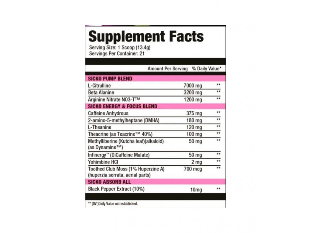 Předtréninkový posilovač Sicko Mode je navržen tak, aby během tréninku maximálně podpořil vaše tělo. Velmi vysoký počet pump, včetně pokročilého argininu NO3-T, vám umožní užít si velmi velkou svalovou pumpu nebývalé velikosti. Produkt funguje velmi dobře jako bez boosteru. Stimulační a nootropní přísady zase umožňují výrazné zvýšení koncentrace, koncentrace a intenzity cvičení.