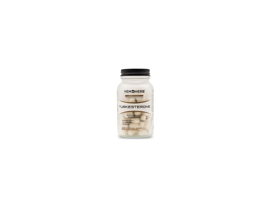 Vemoherb Turkesterone obsahuje extrakt z Ajuga, který podpoří hladinu testosteronu a posílí obnovu glykogenu ve svalech. Hlavním přínosem tohoto produktu je, že 1 kapsle obsahuje až 500 mg tohoto extraktu z Ajuga. Přispívá také k budování svalové hmoty a snižuje poškození svalů během tréninku. Turkesteron je 100% přírodní produkt, který pochází z rostlinného zdroje, který se přirozeně vyskytuje v malých množstvích v potravinách, které běžně konzumujeme, jako je špenát, houby nebo chřest. Turkesteron je považován za nejúčinnější z hlediska vlivu na růst svalové hmoty a také pomáhá spalovat nežádoucí tuk. Není vhodné pro děti, těhotné a kojící ženy. Nenahrazuje pestrou stravu a slouží pouze jako doplněk stravy, proto nedoporučujeme překračovat denní doporučenou dávku.